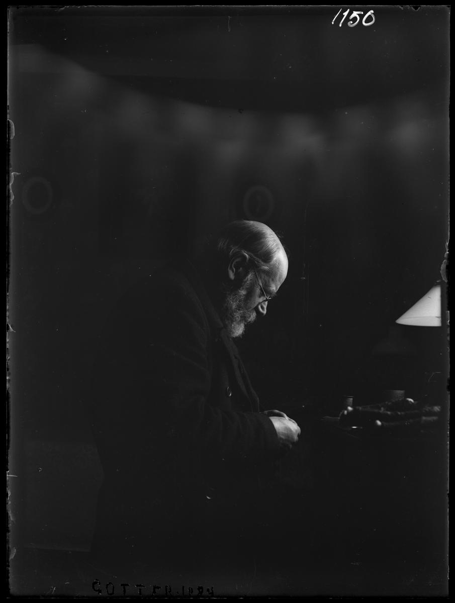 På kuvertet står följande information sammanställd vid museets första genomgång av materialet: Gottfrid Dahlgren vid sitt skrivbord.