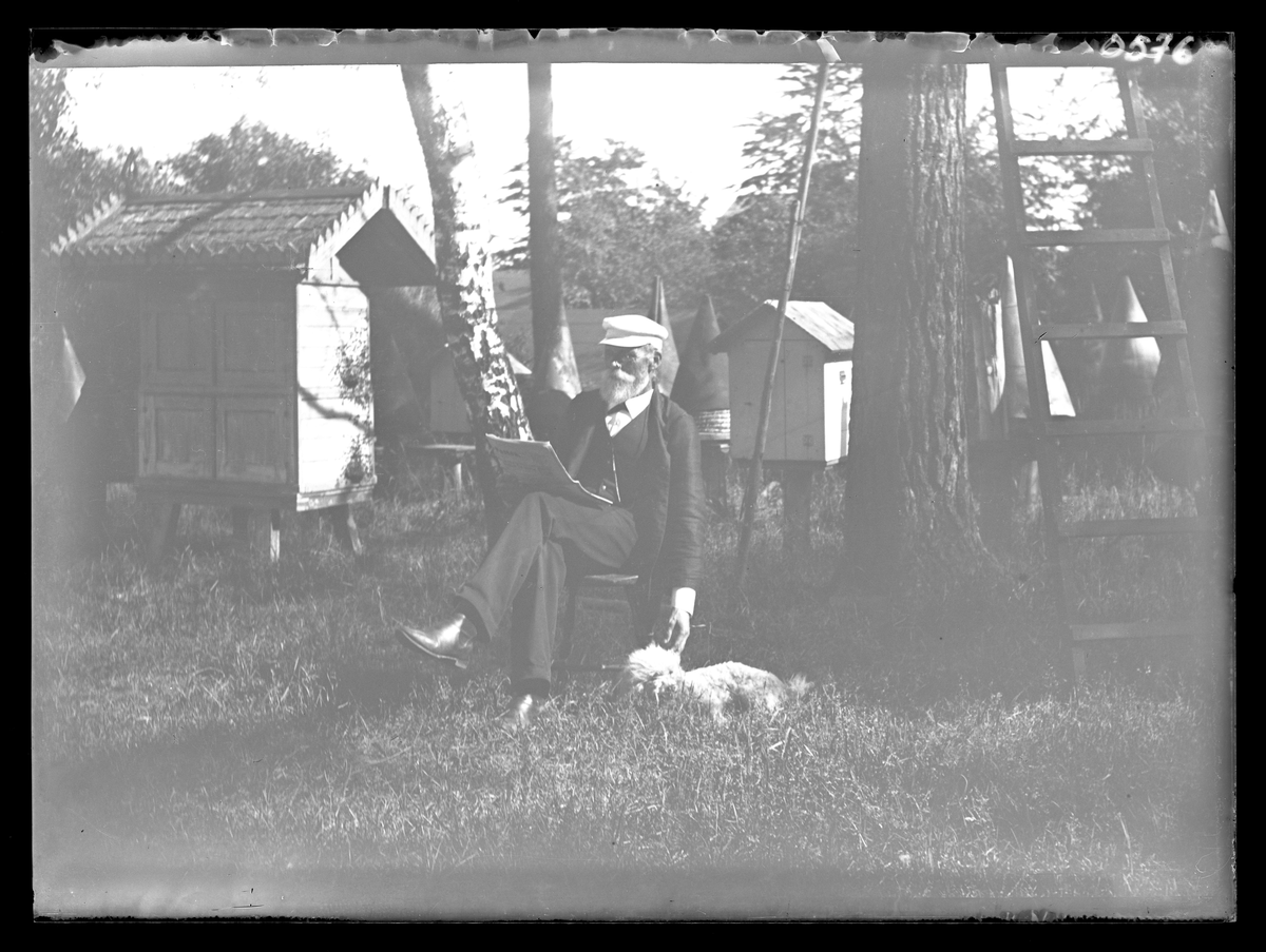 På kuvertet står följande information sammanställd vid museets första genomgång av materialet: Man sitter och läser, exteriör.