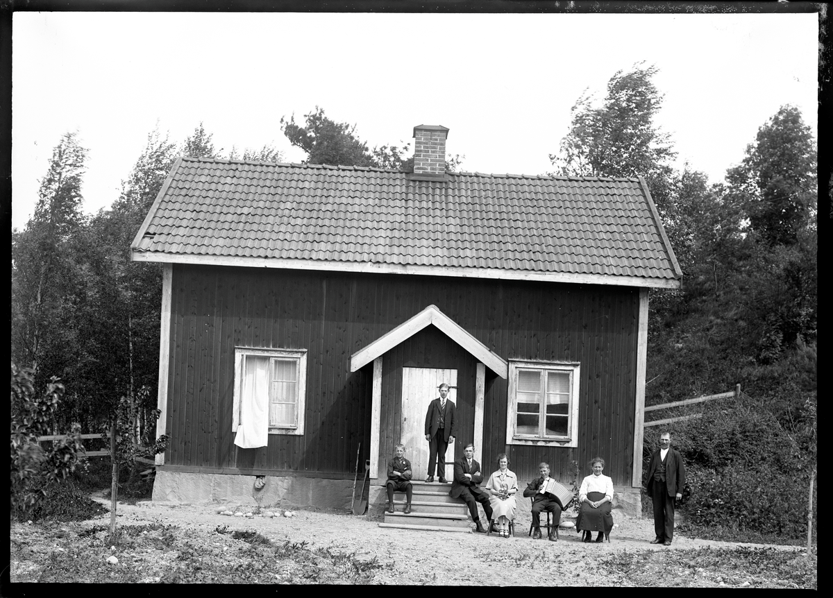 Grupporträtt, flera personer sitter framför ett hus. Palm.