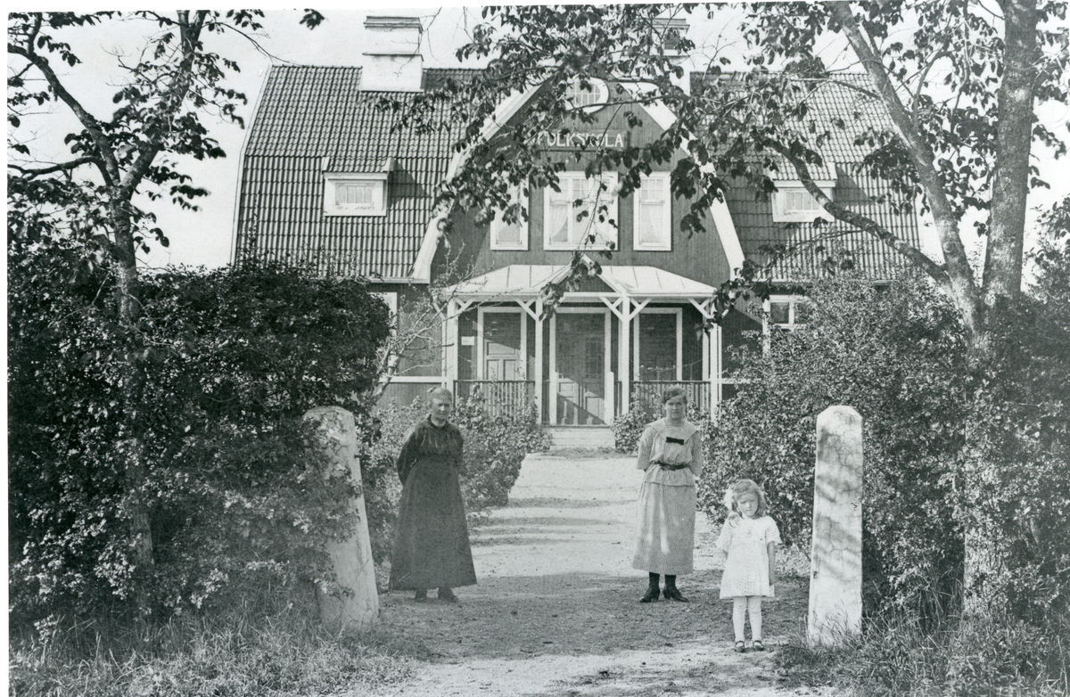 Tre personer utanför Kivsta skola. C:a 1915-1920.
