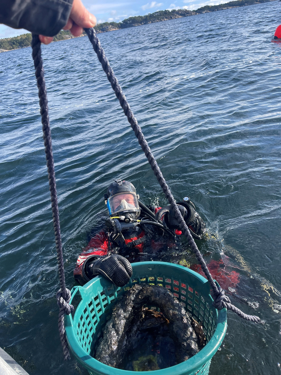 Ankarkabeln lades i en korg som sedan lyftes upp med en vinsch från pontonen