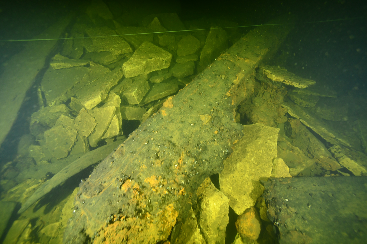 Kammarladdad järnkanon där en del av eldröret har knackats loss. Fotad ovanifrån akterut.