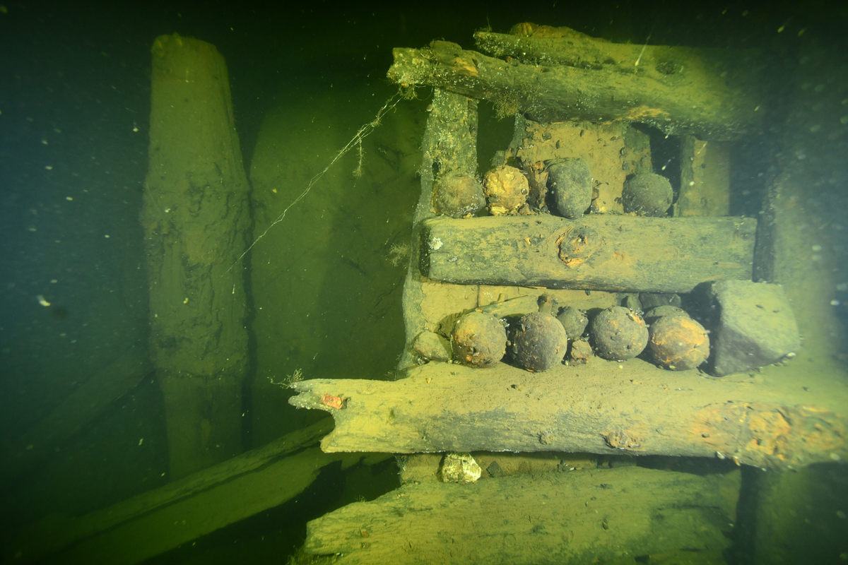 Kanonkulor som ligger på två olika ”hyllor”. Fotad akterifrån.