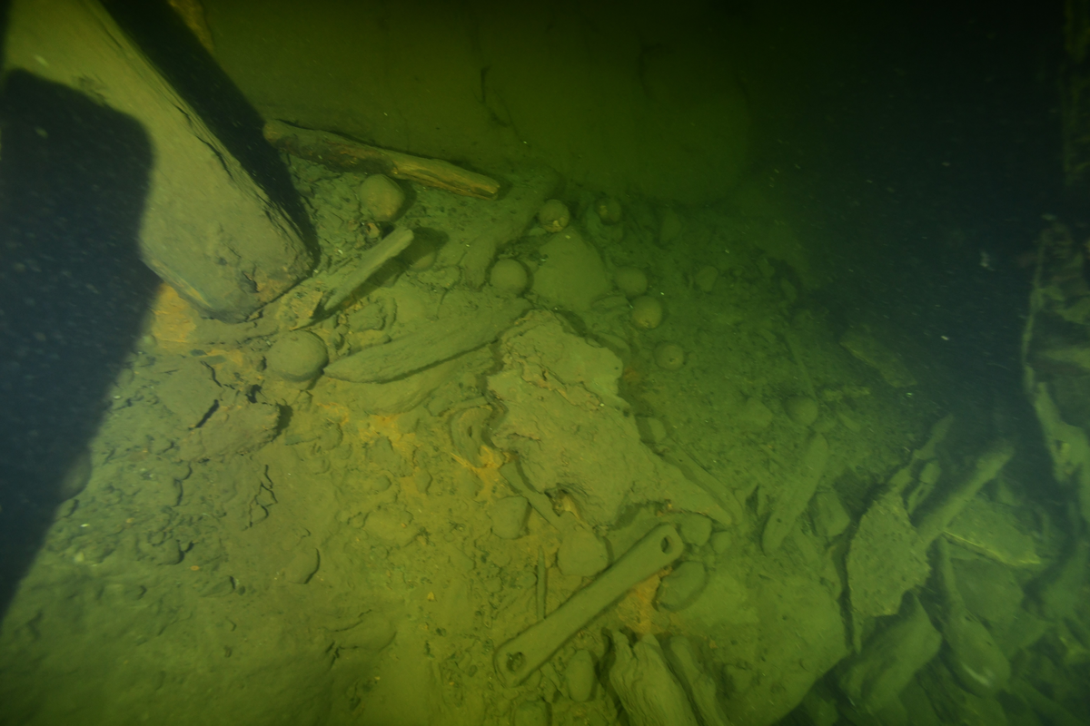 Område med flera kanonkulor och bearbetad detalj. Fotad med akterpartiet åt höger.