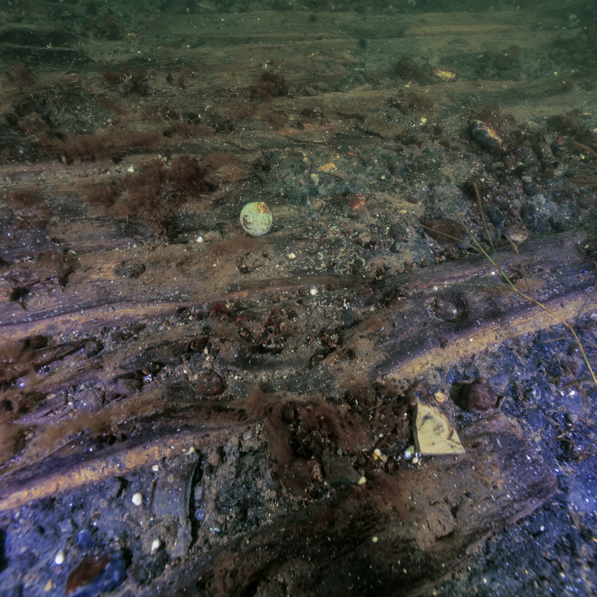En blykula 2 cm i diameter. Ligger löst på skrovsidan.