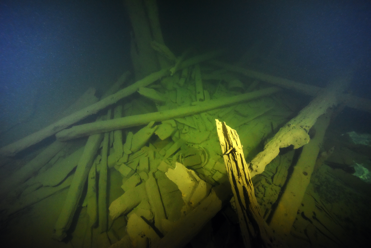 Skrovet och överbyggnaden har kollapsat i aktern. Akterstäven med rodret står dock kvar på sin plats.