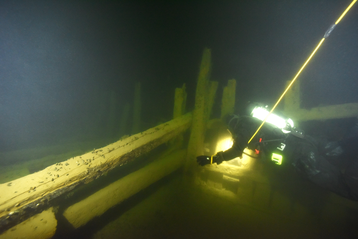 Skeppet har både tvärsgående och längsgående balkar, som stärker upp skrovet och masterna. Den övre balken i bild har fallit ner. Balkvägaren syns ligga snett ner till höger i bild.