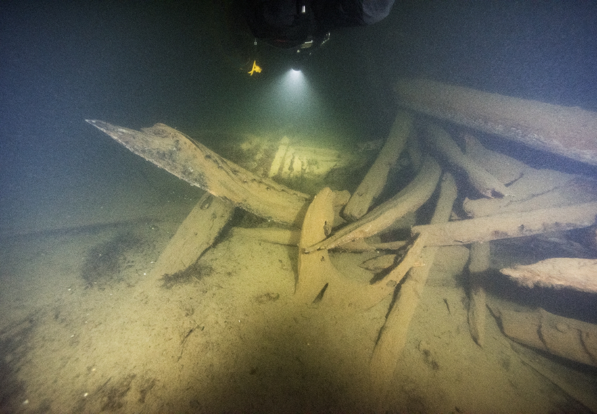 Bilden visar förstäven med ett trappstegsurtag, som fallit ut en bit samt ankarklyset. Förstäven är rund till sin form. Ankarklysets utformning är i princip identisk med det som finns på Kraveln vid Franska stenarna, ett av Gustav Vasas första fartyg som köptes från Lübeck.