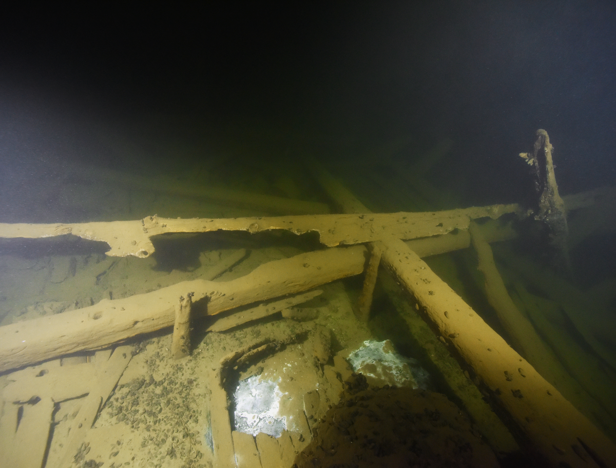De tunnare timren som står lodrätt i bilden bedöms kunna vara delar av skottet till kajutan. Notera urtaget i balken som sannolikt varit till för alpumpen. Tunnan till vänster i bild är provtagen och daterad till 1540-talet.