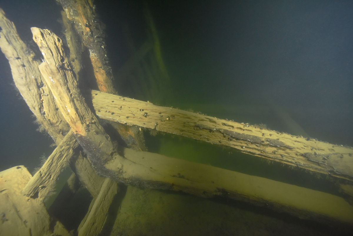 Till vänster i bild ser man knät fortfarande i sitt ursprungliga läge. Den övre balken ligger i sitt ursprungliga läge ovanpå balkvägaren, som sitter längsgående i spanten. Även den undra balken har samma konstruktion. På insidan av balkarna sitter även en stinnare fortfarande på plats, och man ser ytterligare en i förgrunden.