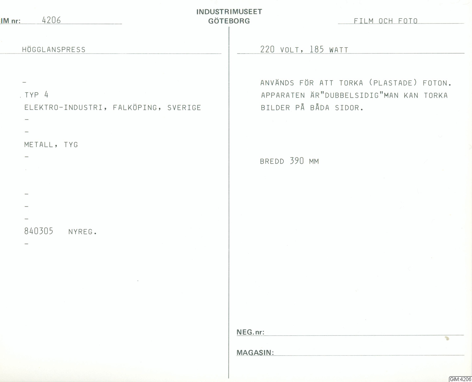 220 volt, 185 watt. Används för att torka (plastade) fotografier. Apparaten är "dubbelsidig"-man kan torka bilder på båda sidor.