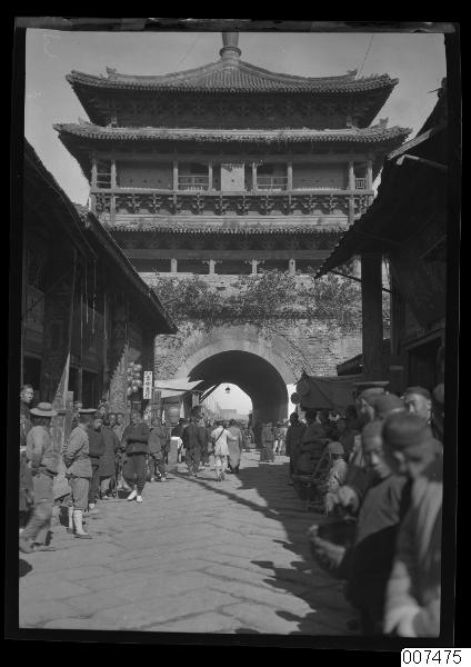Enligt text på fotokuvert Si-an. Stadsport med människor som passerar in och ut genom porten.