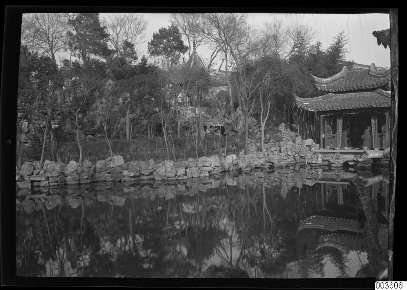 Suzhous trädgårdar 1923. Centralt i bilden en damm. I högra kanten en paviljong. Dammen kantas av träd, allt speglat i vattnet i dammen.