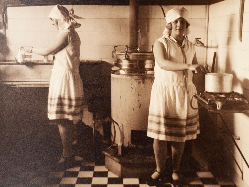Svartvitt fotografi monterat på vit kartong. Fotografiets motiv föreställer två kvinnor i ett kök där den ena värmer mjölk på en spis och den andra fyller en flaska. Runt omkring i rummet finns barnsängar. Undertill fotografiet står det med brun skrift "På Barnavårdskurs Vårterminen 1929". I nedre högra hörnet på kartongen undertill fotografiet finns en signaturstämpel "Tönnes Tönnesson Häsingborg".
