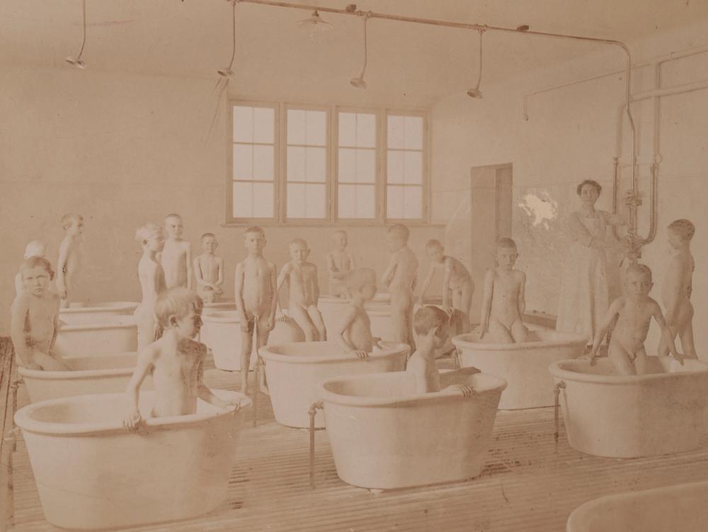 Svartvitt fotografi monterat på grå kartong. Fotografiets motiv föreställer pojkar och en lärare i ett duschrum på Magnus Stenbocksskolan där pojkarna badar i badkar. I nedre högra hörnet på fotografiet finns en signaturstämpel "Emil Bruno Helsingborg". Undertill fotografiet finns en vit pappersremsa med texten "Karbad och duschrum, Magnus Stenbocksskolan, 1912".
