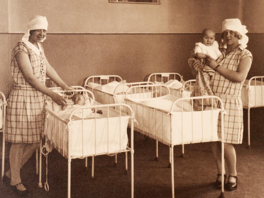 Svartvitt fotografi monterat på vit kartong. Fotografiets motiv föreställer två kvinnor där den ena håller i en bebis och den andra matar en bebis i sängen med en nappflaska. Runt omkring i rummet finns barnsängar. Undertill fotografiet står det med brun skrift "På Barnavårdskurs Vårterminen 1929". I nedre högra hörnet på kartongen undertill fotografiet finns en signaturstämpel "Tönnes Tönnesson Häsingborg".