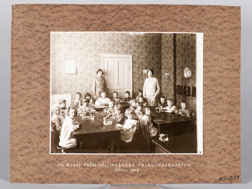 Svartvitt fotografi monterat på brun kartong. Fotografiets motiv föreställer barn som pysslar inne i ett rum med blommig tapet med två lärarinnor som står längst bak vid en vit dörr. Undertill fotografiet finns en vit text "En klass från Hälsingborgs folkkindergarten våren 1929". I nedre högra hörnet på kartongen finns en signaturstämpel som är otydlig.