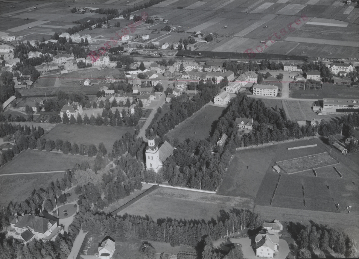 Flygfoto över Orsa. Orsa kyrka och Orsa bebyggelse, år 1950.