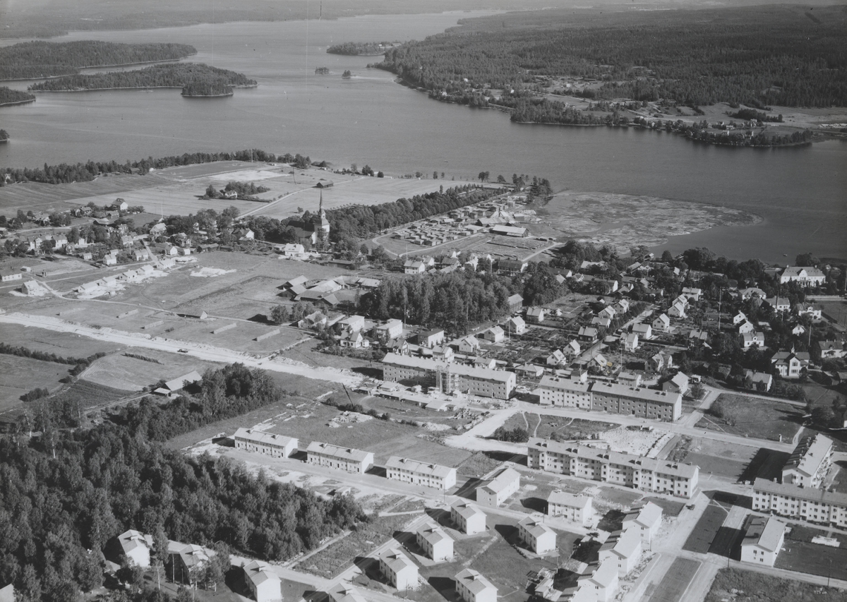 Flygfoto över Smedjebacken. Smedjebacken med Norrbärke kyrka år 1950.