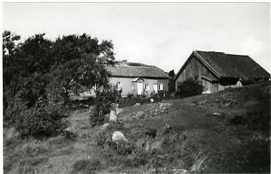 Gammal gård nära Lerkil i Vallda. Bostadshus och ladugård med utedass. Farstun till bostadshuset har välvt tak.