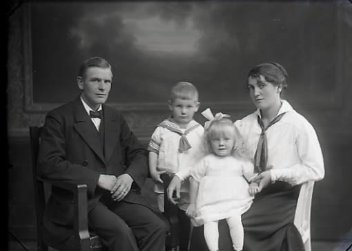 Familjebild, föräldrar med en liten flicka och pojke i 3/4 figur. Ateljébild. Beställare: Per Andersson, Falkenberg, Lannavägen 4. Fotografiet är taget i Björkströms filial i Falkenberg.