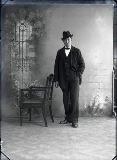 Ateljébild av Karl Johansson i helfigur iklädd kostym, fluga och hatt vid en stol. Beställare: F Hjalmarsson, Falkenberg.