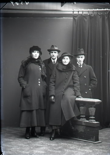 Ateljébild. Två unga kvinnor och två män i ytterkläder och hattar. Beställare: Nils Liljegren, Falkenberg. Björkströms filial i Falkenberg förestods av Ester Liljegren så möjligen är det en släkting.