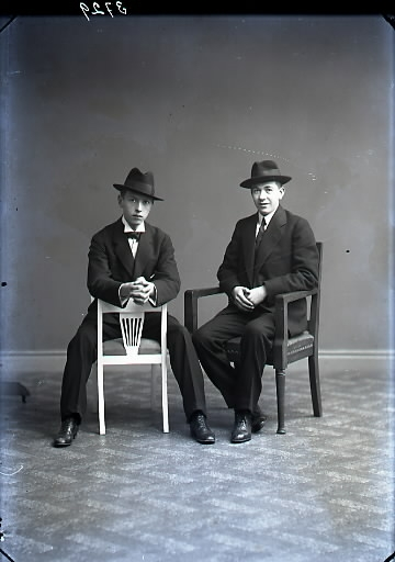Ateljébild, Två sittande unga män i hatt och kostym. Den ene sitter på en taburett med armarna över dess ena gavel. Beställare och troligen avbildad: H Larsson. Har även beställt bildnr GB2_1774.
