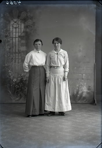 Ateljébild. Två kvinnor stående i helfigur. Beställare och sannolikt avbildad: Anna Emanuelsson.