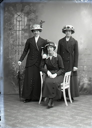 Ateljébild. Tre kvinnor i helfigur där hon i mitten sitter på en taburett. Samtliga bär smalbrättade, rikt dekorerade hattar och ytterkläder med stora knappar. Den ena kvinnan stödjer sig på ett paraply. Beställare: Ida Andersson, Gunnarp.