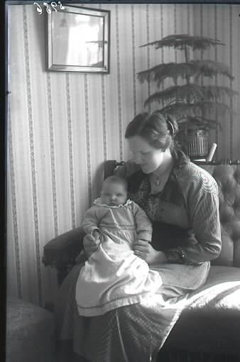 Mor med liten baby sitter i en soffa i hemmiljö med en krukväxt bakom dem. Beställare: Handl. Georg Jönsson Falkenberg.