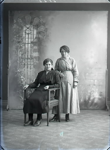 Ateljébild. Två kvinnor i helfigur varav en sitter. Beställare: Nanny Nylander, Falkenberg. ( Rika Skoog)