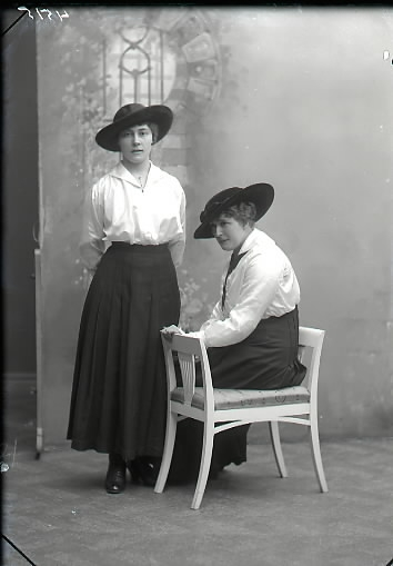 Ateljébild. Två kvinnor i helfigur varav en sitter. Båda bär mörka hattar och långkjolar samt ljusa blusar. Beställare: Fröken Åkerblad (Goos)