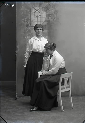 Ateljébild. Två kvinnor i helfigur men den ena sitter tankfull med en bok på taburett. Beställare: Fröken Åkerblad (Goos)