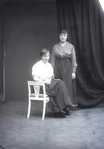 Ateljébild. Två unga kvinnor i helfigur varav en sitter på en taburett. Beställare: Lucia Larsson, Sanddynerna 10, Falkenberg.