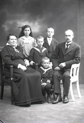 Ateljébild. Familjen Ringström, föräldrar med fyra barn. Makarna sitter med barnen stående mellan sig, utom den minste som sitter främst på en pall. Beställare: Ringström, Kemikalieaffären Falkenberg.