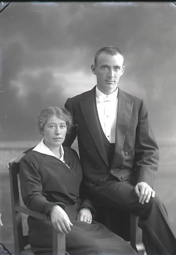 Ateljébild. Parporträtt, kvinna i stol med mannen sittande på ena armstödet. Beställare och sannolikt avbildad: Gordon Mackeracker, Falkenberg. (Se även bildnr GB2_6083, GB2_6084)