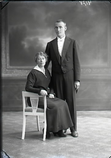 Ateljébild. Ungt par där kvinnan sitter på en taburett med mannen i frack stående bredvid. Beställare och sannolikt avbildad: Gordon Mackeracker, Falkenberg. (Se även bildnr GB2_6082-83)
