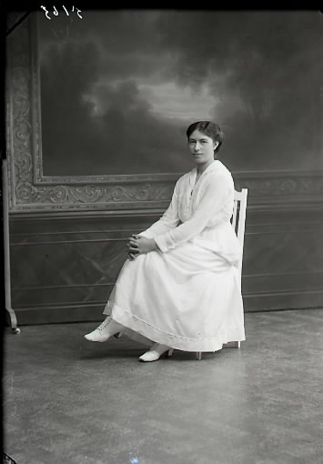 Ateljébild. Kvinna sittande i helfigur, troligen helt klädd i vitt, även snörkängorna. Beställare: Fröken Kristensson, Hotellet, Falkenberg.