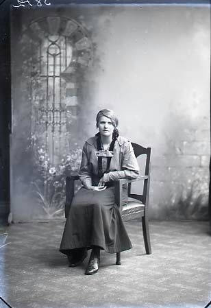 Ateljébild. Kvinnoporträtt, ung kvinna sittande i helfigur. Beställare: Elsa Backvall, Västra Gärdet 31, Falkenberg