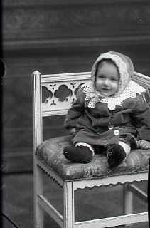 Ateljébild. Babyporträtt, baby sittande i helfigur i ytterkläder med spetskrage och spets även på mössan. Beställare: Fru Johansson, Väderkvarnen, Falkenberg.