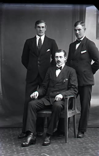 Ateljéfoto med tre herrar, varav en sitter. Beställare: Karl Holmgren, Gammelgården.