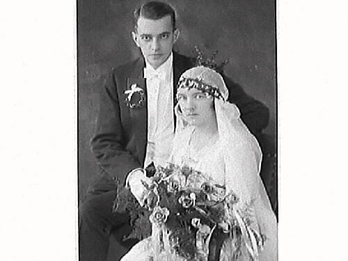 Bröllopsbild. Erik Andersson, Falkenberg, med fru. Brudpar. Beställningsort: Falkenberg, Bröderna Wiklund