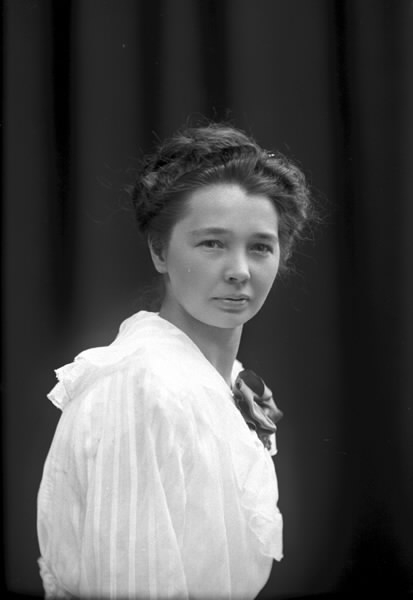 Ateljébild. Kvinnoporträtt i bröstbild. Beställare avbildad: Jenny Hansson, Bröderna Svensson.