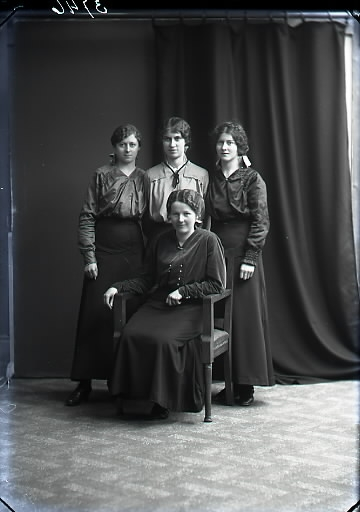Ateljébild. Fyra unga kvinnor (troligen systrar) med ondulerade frisyrer i blusar och långkjolar. Beställare: Karin Hedström, Falkenberg.