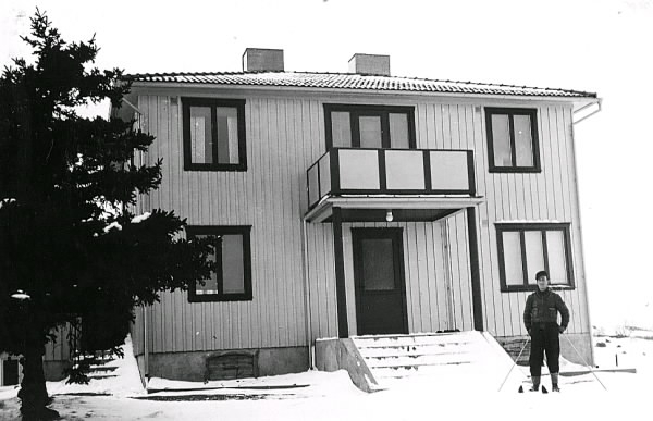 Vinterbild med exteriör av en funkisvilla och en man på skidor vid trappan. Meddela oss gärna om du känner till något om byggnaden och platsen!