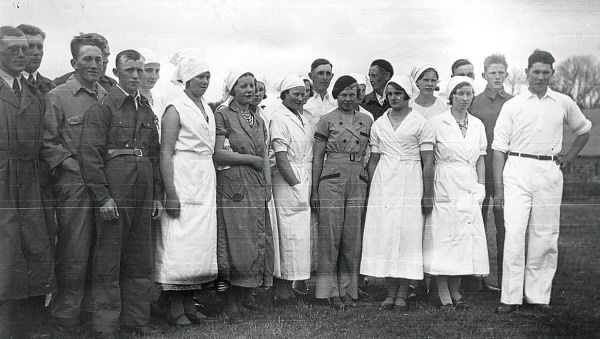 Wapnö gård. Gruppbild av deltagarna i DM i mjölkning. Anordnad av Hallands distrikt av JUF. Bilden var publicerad i Hallands Nyheter, 1935-05-18, "DM i mjölkning till Inga Jansson, Snöstorp". Tillhör samlingen med fotokopior från Hallands Nyheter som är från 1930-1940-talen.