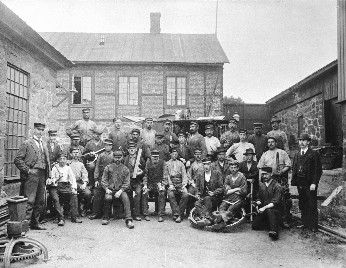 Arbetsstyrkan vid Varberg Mekaniska Verkstad omkring år 1900 samlad ute på gården. Med sig har männen olika verktyg som visar på deras profession; passare, tänger, klubbor, hammare, rubank med mera. Två män sitter dessutom på ett stort kugghjul. Här tillverkade man på beställning, främst redskap och maskiner som behövdes främst inom jordbruk och mejerinäringen men vissa produkter lagerhölls också. Förutom maskinavdelning fanns även snickeri- respektive plåtslageridel. Verkstaden startades på 1850-talet (då Ungewith & Co, spistillverkning) och drevs av olika personer fram till 1890-talet då Hugo Gerlach övertog företaget och brodern ingenjör Edmund Gerlach (död 1902) blev disponent. Verkstaden hade anlagts tämligen isolerat norr om den gamla trästaden, men vid det laget låg den mellan järnvägsstationen och den nya stenstaden, granne med de s k Tvillinghusen. Såsom ingenjörsdriven verksamhet fanns utöver gjuteri, maskinverkstad, smedja, magasin och koksbod även en ingenjörsbostad inom anläggningen. Enligt uppgift började arbetarna kl 6 och slutade 18.30. Maten fick de om vintern sitta och äta på ångpannan. (Se även bildnr VMA8141_1)