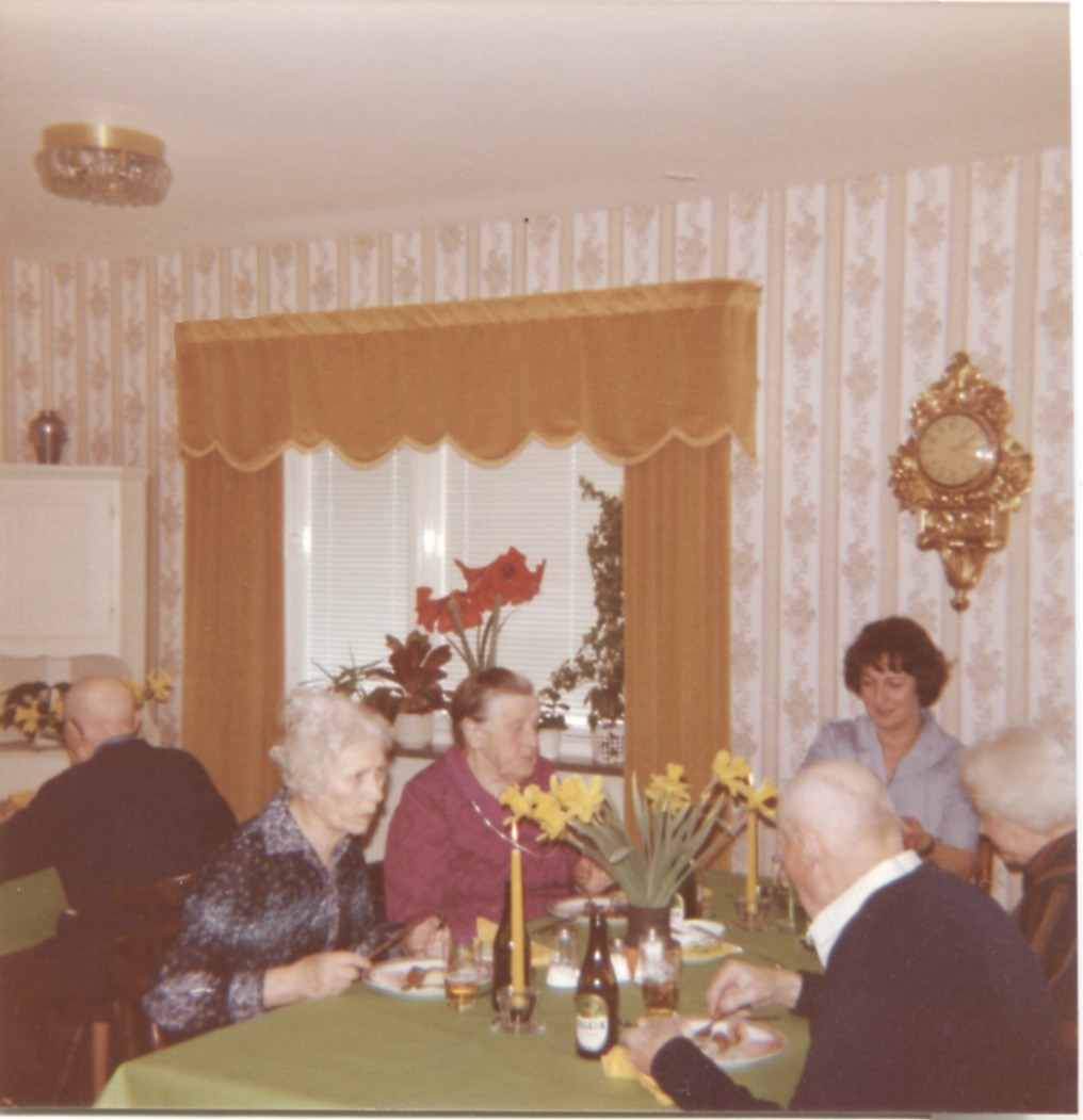Middag för boende och personal, Brattåshemmets matsal 1970-tal. Namnuppgifter saknas.