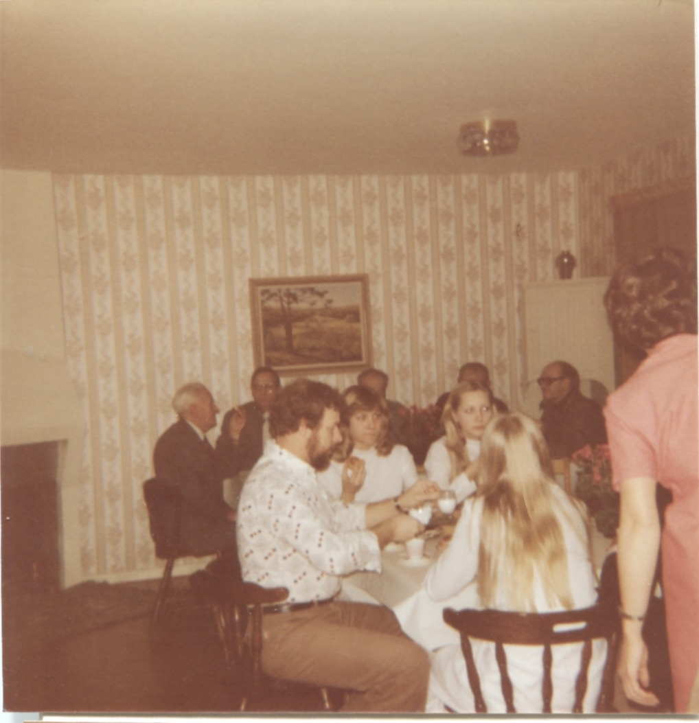 Fikastund i Brattåshemmet 1970-tal. Tjänstemän från Socialförvaltningen är på besök. I bakgrunden ses bl.a Bertil Gudmundsson, äldreomsorgschef och Bengt Alvekrans, socialchef.